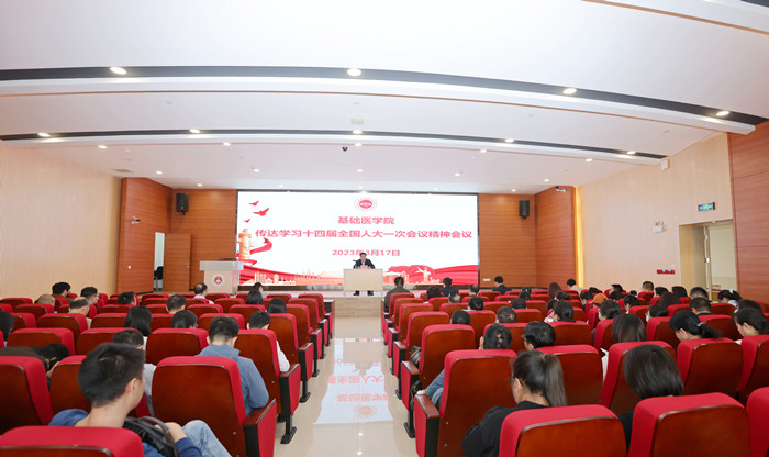 会上,谭国鹤同志对十四届全国人大一次会议的重大意义进行了深入解读,传达学习了习近平总书记在全国两会期间的系列重要讲话精神,特别是在十四届全国人大一次会议闭幕会上的重要讲话精神,并分享了个人的履职感受。他表示,作为新当选的全国人大代表,深感使命在肩、责任巨大,希望通过深入学习宣传贯彻十四届全国人大一次会议精神,激励带动全院教职工努力为边疆民族地区医学教育事业高质量发展贡献更多的科技智慧、教育力量和医学担当。