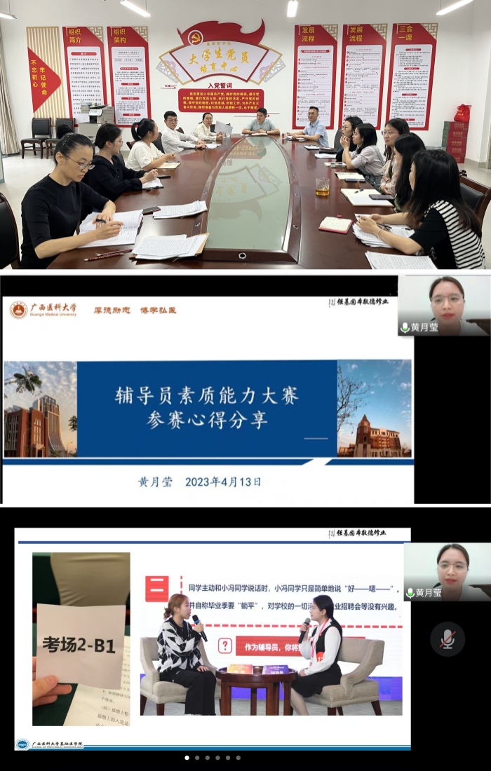 备赛期间,为增进参赛辅导员对大赛规则和赛程安排的了解,会务组召开赛前培训会,邀请第十一届广西高校辅导员素质能力大赛二等奖获得者、伟德国际bevictor1946辅导员黄月莹老师进行线上专题分享,详细介绍了基础知识测试、谈心谈话和案例研讨的赛制规则,并分享备赛心得,传授应试技巧。