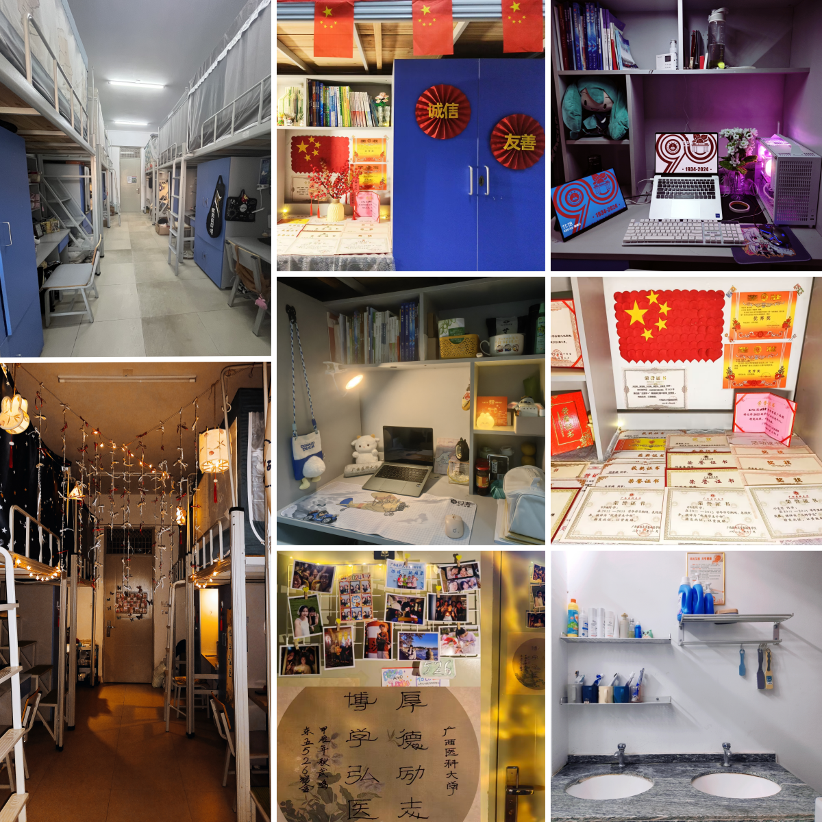 本次活动分为宿舍安全卫生检查、宿舍文化海报绘制和现场汇报展示三个环节。部分宿舍巧妙运用装饰增添生活气息,墙壁上的励志标语折射了同学们积极进取的态度,表达了同学们对生活的热爱;海报设计紧扣“宿说九秩,共绘未来”的创作主题,将宿舍文化和校史、校庆元素相融合,绘制出缤纷的宿舍文化;现场展示环节,15个入围决赛的宿舍代表依次上台,展示自己独特的宿舍文化,如东六208宿舍的“九秩芳华,携手同行”,将校庆元素、校花三角梅元素与宿舍文化巧妙结合,表达了青春奋进、与校同行的美好期望;东六226宿舍的“青囊承雅,韵传九秩”,以医学精神携手共进,奔赴爱与理想。