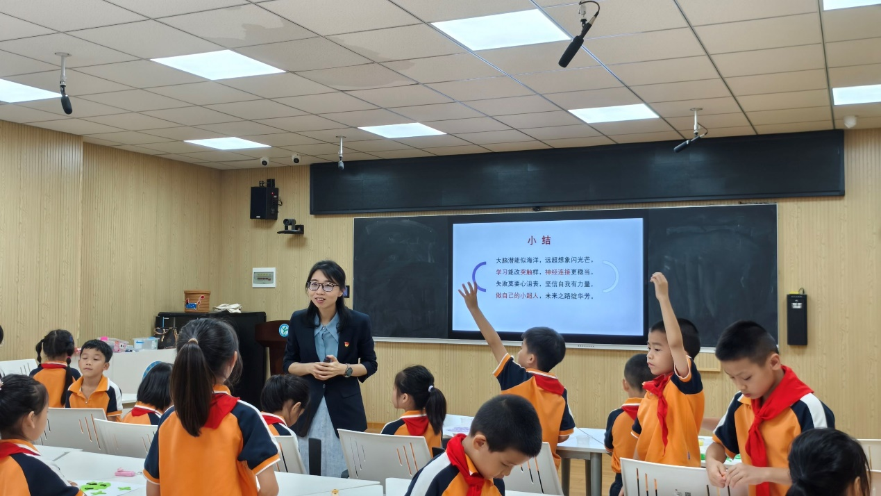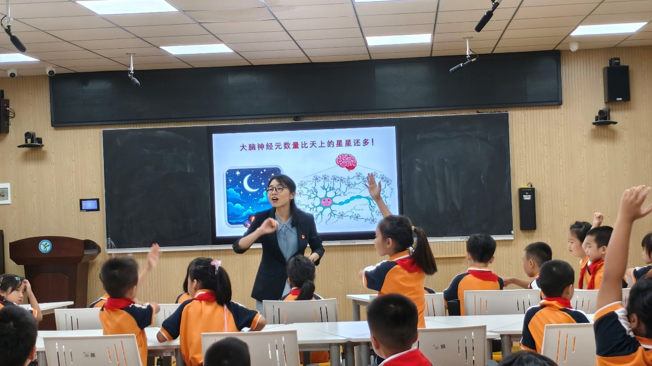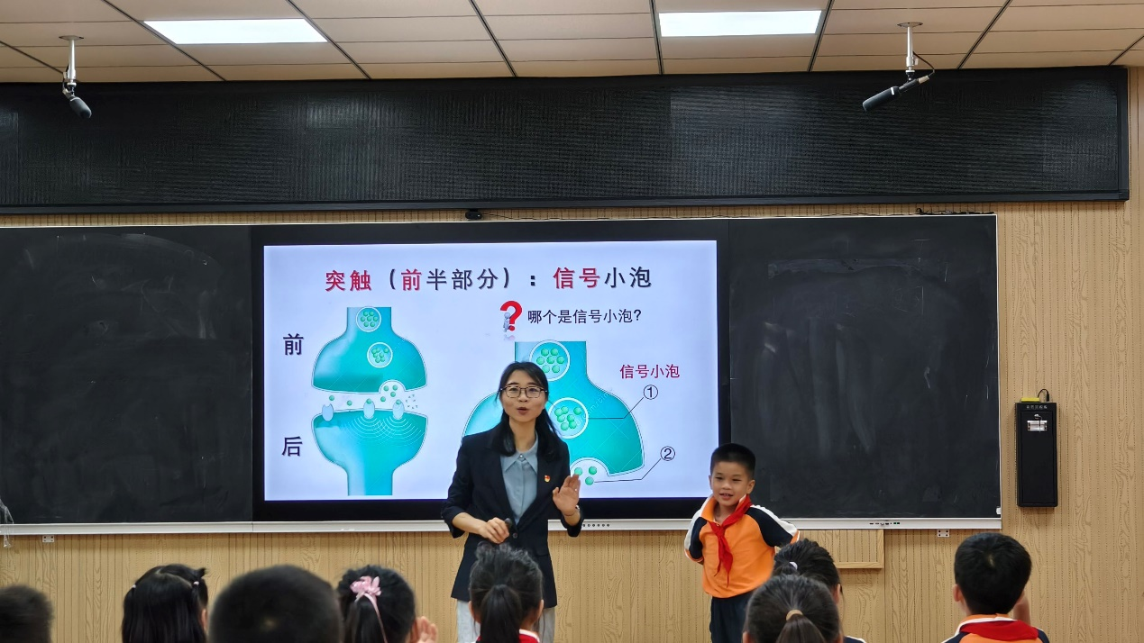 本次活动以“解密突触超能力”为主题。在附小一(2)班的课堂上,教研室党支部书记葛盈盈以生动有趣、通俗易懂的方式,带领小朋友们踏上了探索大脑奥秘的奇妙之旅。在她的引导下,小朋友们认识了神经元的独特形态与重要功能,了解了突触的形成过程,以及影响突触信号传递的关键结构。在实践学习环节,经过党员教师们耐心指导,小朋友们发挥个人想象力和创造力,用彩色黏土在白纸上制作信号传递状态下突触的简易模型。在这个过程中,孩子们不仅锻炼了动手能力,更对所学知识有了更深入的理解。活动中,葛盈盈还通过一段视频,直观展示了学习与不学习对突触结构及大脑神经网络的动态影响,让孩子们充分认识到学习的重要性。最后,孩子们齐声朗读了以突触为主题的科学启蒙励志诗。